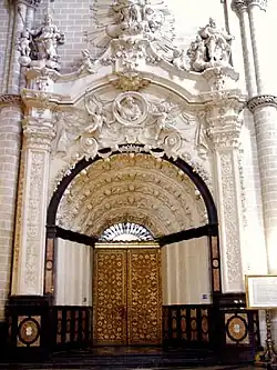 A la sacristía se accede a través de una puerta mudéjar con elementos renacentistas y góticos de madera dorada que se enmarca en una portada barroca de yeso que muestra las figuras del Salvador, San Joaquín, la Virgen y San José, con el Niño, el Padre Eterno y el Espíritu Santo.