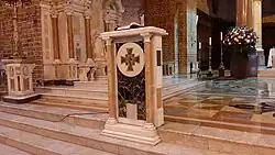 169. a b c Piedrahíta Echeverri, Monseñor Javier (2002). «Cap. 7, La Decoración de la Catedral (Pavimento del Presbiterio Central)». Monografía Histórica de la Catedral-Basílica la Inmaculada de Villanueva en Medellín. pp. 29-30.