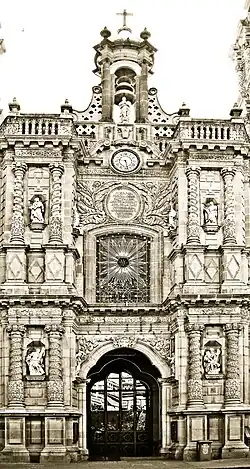Entre estos, se ubican las hornacinas, también seis en los dos cuerpos, en donde se encuentran colocadas las esculturas de los doce apóstoles. Estas esculturas fueron esculpidas en mármol de Carrara por los hermanos Biaggi; fueron encargadas por el obispo Montes de Oca, para reemplazar las anteriores de cantera. Estas esculturas de mármol son réplicas fieles de las que se encuentran en el interior de la Archibasílica de San Juan de Letrán en Roma; además, es el único templo en el mundo con 24 esculturas de los apóstoles: las 12 de mármol en la fachada y las otras 12 de cantera en las orillas del techo del templo. El arco de entrada del primer cuerpo es de medio punto. En el segundo cuerpo se observa un medallón de forma ovalada, que en un principio tenía esculpido el escudo de la ciudad. El tercer cuerpo, formado por barandales que rematan los contrafuertes y en medio de éstos, se ubica el reloj, coronado por un templete que resguarda una escultura de la virgen María. Es uno de los más bellos ejemplos del barroco salomónico de México. A pesar de haber sido restaurada conserva su aspecto original.[3]