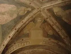 La gran bóveda de crucería que cubre el presbiterio del siglo xiii, como ya se ha dicho, está decorada completamente con frescos que, descubiertos y restaurados en 1957,[4] se han conservado óptimamente hasta nuestros días. En los cuatro plementos, dentro de tondos, están colocados los símbolos de los cuatro evangelistas, mientras en las lunetas están representados un Arcángel y el Árbol de la vida. El resto de la bóveda está densamente decorado con cornisas, rosetones y motivos geométricos, además de las nervaduras. En la clave de bóveda está representado el Cordero de Dios. Sobre la luneta que da hacia la platea está pintada la Virgen rezando incensada por los ángeles, que, al igual que el Cristo bendiciendo situado de frente, presenta características notablemente bizantinas.[4] También se pueden apreciar fragmentos de pinturas de ese mismo periodo, que representan una Hilera de ángeles dentro de clípeos, debajo de la decoración a racimos del siglo xv del arco de entrada al nuevo presbiterio.