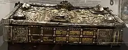 Los paneles laterales largos y cortos contienen inserciones y montajes de diferentes fases. Los lados largos consisten principalmente en contener adornos de animales tradicionales y diseños abstractos. Las monturas dominantes en los lados cortos contienen patrones más sofisticados influenciados por el estilo Ringerike del arte vikingo.[7]
