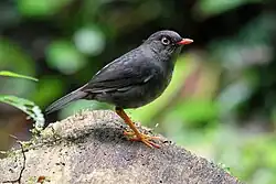 Mide 17 cm de largo, su dorso y cabeza son gris oscuro, su garganta y vientre son grises. Sus patas, pico y anillo ocular son naranja brillante. Su iris es de color claro, lo que lo distingue de otros zorzalitos similares.[3][4]
