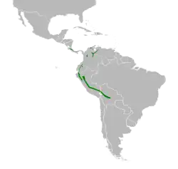 Se lo encuentra en Bolivia, Colombia, Costa Rica, Ecuador, Panamá, Perú, y Venezuela.