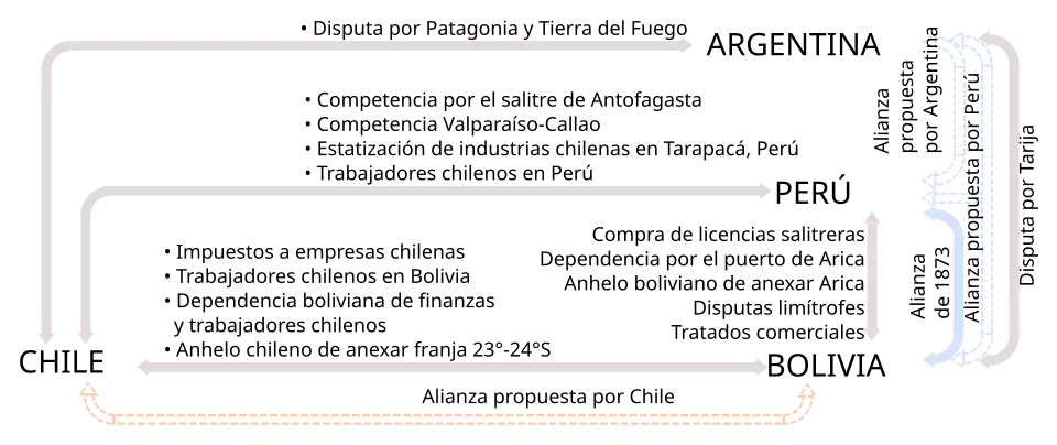 Varios sucesos ocurridos durante la formación de las repúblicas, tanto sucesos políticos como económicos y sociales, acentuaron las diferencias y los antagonismos: la cesión por Simón Bolívar del actual territorio de Antofagasta a Bolivia, la guerra contra la Confederación Perú-Boliviana (1836), la expansión de empresas y trabajadores chilenos en Perú y Bolivia, la permanente competencia entre Valparaíso y El Callao por atraer el comercio americano con Europa,[6]: 39 la continua amenaza boliviana de unirse ya sea a Perú o a Chile en detrimento del otro, la estabilidad institucional de Chile al contrario de la inestabilidad en Perú y Bolivia, la expedición de Quevedo desde Chile contra el gobierno boliviano de Frías, el conflicto limítrofe entre Bolivia y Perú que duraría entre 1825 hasta 1909, etc.