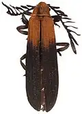 El escarabajo tiene un cuerpo delgado, aplanado dorsoventralmente y débilmente esclerotizado, de unos 8 mm de largo. El pronoto y la mitad basal de las cubiertas son de color rojo anaranjado, mientras que el resto del cuerpo es de color marrón oscuro o negro. El pronoto y el tegumento están cubiertos de pelo anaranjado. Las antenas de la hembra son muy dentadas, mientras que las del macho tienen antenas cortas y laminares. La cabeza es pequeña y está equipada con ojos compuestos hemisféricos con diámetros de 1,28 veces su separación. El pronoto es 1,39 veces más ancho que el largo y plano. Tiene bordes laterales ligeramente elevados y convexos y ángulos traseros agudos. Una quilla longitudinal atraviesa el centro del tercio frontal del pronoto, luego se divide para formar costillas que bordean la areola central, que llega al borde basal del pronoto. Las cubiertas tienen cuatro nervaduras longitudinales primarias bien desarrolladas y cinco ranuras longitudinales secundarias poco desarrolladas. Además, entre estas ranuras hay costillas transversales densamente espaciadas que dividen la superficie de los párpados en pequeñas células (aréolas). Los genitales masculinos se caracterizan por un pene largo y delgado con su mayor anchura en el centro.[2]