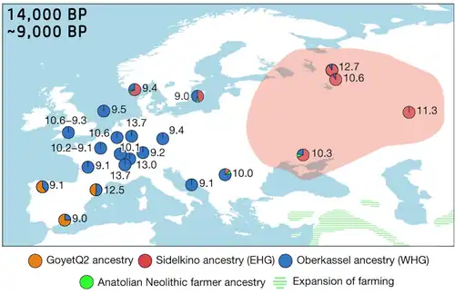 - ↑ Lazaridis et al. (2016) encontraron que los SHG eran una mezcla de EHGs y WHGs: "Los cazadores-recolectores orientales (EHG) derivan 3/4 de su ascendencia de los ANE... Los cazadores-recolectores escandinavos (SHG) son una mezcla de EHG y WHG; y los WHG son una mezcla de EHG y el Paleolítico Superior Bichon de Suiza."[13]