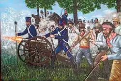 Celedonio Escalada y sus milicianos en la escaramuza del 30 de enero de 1813. Pintura sobre relieve de Alberto Nassivera. | ||