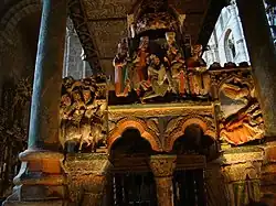 La historia de los relieves entre los arquillos lobulados consta de varias escenas repartidas en cada unos de los laterales.