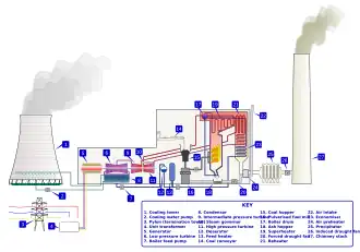 Una central eléctrica de carbón es un tipo de central de combustible fósil. El carbón se pulveriza generalmente y luego se quema en una caldera de carbón pulverizado. El calor del horno transforma el agua de la caldera en vapor, que luego se utiliza para girar turbinas que giran generadores. Así, la energía química almacenada en el carbón se transforma sucesivamente en energía térmica, energía mecánica y, por último, energía eléctrica.
