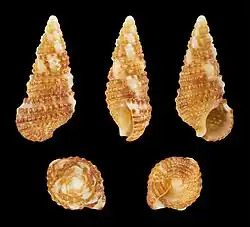 La concha de este molusco es turriforme, de color marrón obscuro casi negro, con bandas o manchas de color marrón rojizo. La apertura es aplanada del lado de la vuelta corporal. Presenta una ornamentación de tres a cuatro filas de nódulos en espiral de tamaño más o menos similar y una o dos várices en la vuelta corporal. La abertura está desplazada hacía el lado derecho, con el labio externo engrosado y un canal sifonal ancho y corto. Alcanza los 20 mm de longitud.[3]