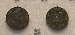 - De cobre con año 1766, en el anverso con un busto de hombre con peluca de época y orlado con la leyenda: :THE * RESTORER * OF * COMMERCE * 1766 : NO STAMPS (El restaurador del comercio * 1766 * sin sellos), y en el reverso con un barco de tres astas con tres velas y cinco banderas inglesas, con dirección a la palabra en oblicuo: AMERICA, y orlado con la leyenda: THANKS TO THE FRIENDS OF LIBERTY AND TRADE (Gracias a los amigos de la libertad y el comercio), estas fichas conmemorativas o tokens eran conocidas como las «monedas de Pitt».[37] - 1⁄2 penique de cobre con años de 1722 a 1723 con ceca de Dublín de 22 mm de diámetro (sin figurar el valor, solo reconocible por el tamaño), el anverso semejante al anterior de la misma época con mismas leyendas: y el reverso con una gran rosa Tudor con o sin corona, orlada con leyenda con variedades en la letra U (como V): * ROSA AMERICANA * UTILE DULCI * (fecha), y conocidas como las «monedas de la Rosa americana». Con años de 1723 y de 1724 con mismo tamaño y sin el valor, en el anverso semejante a los anteriores de la misma época y el reverso semejante a la «moneda de Hibernia» con variedades.[36]