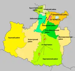 La república está compuesta por dos ciudades de importancia republicana (Cherkesk y Karacháyevsk) y diez raiones. Consta de 149 localidades, de las cuales 4 son ciudades (Cherkesk, Karacháyevsk, Ust-Dzhegutá y Teberdá).