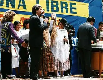 Así como las cholas han conquistado el derecho de vestirse como decidan al acceder a espacios antes vedados, también se recorre el camino inverso, mujeres que adoptan la vestimenta con motivo de celebraciones,[58] acceso a fuentes laborales[59][60] o legitimación como personajes representativos de su comunidad frente a los procesos políticos atravesados por el país.