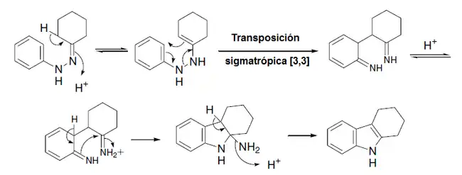 En el primer paso, la fenilhidrazina es condensada con ciclohexanona para formar la base de Schiff correspondiente. El segundo paso, catalizado por ácido clorhídrico, consiste en una transposición con ciclización para formar tetrahidrocarbazol.[3]