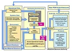 La figura representa la vida de la arquitectura, como ésta evoluciona y muestra el proceso que la arquitectura apoya en el desarrollo, el análisis y la evolución de la arquitectura implementada. En esta ilustración, la vista operacional se usa para manejar los requerimientos que son evaluados contra los sistemas de vista. Las deficiencias de operación se derivan del análisis y la indefinición de candidatos viables. Estos candidatos pueden tomar la forma ya sea de soluciones materiales o no materiales y se remodelan dentro de los sistemas de vistas y vistas operacionales de la arquitectura.[5]