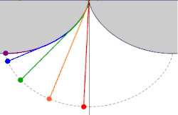 - El extremo de un hilo inextensible inicialmente ceñido sobre el medio arco de cicloide inferior y limitado al círculo superior en , seguirá al punto en su trayectoria sin cambiar su longitud porque la velocidad del extremo es en cada momento ortogonal al hilo (sin estiramiento ni compresión). El hilo será al mismo tiempo tangente en al arco inferior, debido a la tensión y a las condiciones consideradas. Si no fuera tangente, habría una discontinuidad en y, en consecuencia, aparecerían fuerzas de tensión desequilibradas.