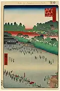 54. El foso de Benkei desde Soto-Sakurada hasta Kōjimachi (外桜田弁慶堀糀町 Soto-Sakurada Benkeibori Kōjimachi?) (5-1856) | El foso, que ahora se llama Sakurada, rodeaba el Palacio Imperial, cuyos altos muros se aprecian a la derecha. En la esquina inferior izquierda un grupo de personas se dirige a la caseta de guardia que aparece en segundo término más al fondo, al lado de un pozo de tres cubos conocido como «Fuente de cerezas», y tras los cuales se eleva la residencia del señor feudal Ii de Hikone (prefectura de Shiga). Al fondo a la derecha, bajo la cartela roja del título de la serie, se ve la torre de vigilancia de Kōjimachi, recién construida dos meses antes de esta estampa tras el terremoto de 1855. En la gama cromática destacan los verdes y azules, especialmente el azul intenso del foso, mientras que en el cielo predomina el blanco.[68] | |||||||