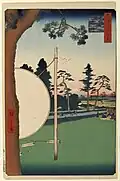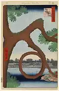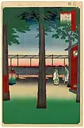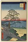 26. El «pino para colgar una armadura» y la cuesta de Hakkeizaka (八景坂鎧掛松 Hakkeizaka yoroikakematsu?) (5-1856) | Hakkeizaka («cuesta de las ocho vistas») era una famosa loma situada sobre la bahía de Edo, desde donde se podían contemplar ocho panorámicas de bellos paisajes de los alrededores. El nombre proviene de las Ocho vistas de Xiao y Xiang (en japonés Shōshō hakkei), un famoso tema poético introducido en el siglo XIV que servía de base iconográfica para la representación de paisajes pintorescos. Sobre la loma se situaba un pino de curiosa forma: según la leyenda, el guerrero Minamoto no Yoshiie colgó su armadura en este árbol, antes de someter a un clan rival en la provincia de Mutsu (actual prefectura de Aomori). El pino domina toda la parte central de la composición, sobre la bahía donde navegan varios veleros. En la línea de la costa se sitúa el Tōkaidō, el camino de Edo a Kyōto, que era muy transitado, como se puede ver en la lámina. Alrededor del pino se sitúan varias figuras más, que contemplan el panorama mientras toman té o sake.[41] | |||||||