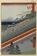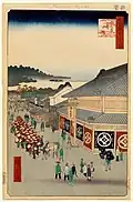 2. Kasumigaseki (霞が関 Kasumigaseki?) (1-1857) | Esta es una composición de acusada verticalidad, donde sobre un eje de una populosa calle de la ciudad se superpone un amplio cielo con diversas tonalidades de color. Se sugiere una cierta perspectiva lineal, en la calle que fluye hacia la bahía de Edo, pero ésta queda mitigada por el intenso cromatismo. En los dos extremos de la calle se encuentran dos residencias de señores terratenientes (daimyō): a la izquierda, los Asano de Hiroshima, y a la derecha, los Kuroda de Fukuoka. En los márgenes destacan también dos grandes pinos (kadomatsu). Entre la gente pueden reconocerse unos danzarines, un sacerdote y varios samuráis. En el cielo vuela una cometa que contiene el símbolo sakana («pez»), primer elemento del apellido del editor Sakanaya.[18] | |||||||