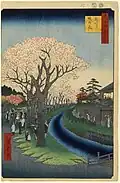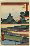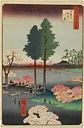 14. Jardines de un templo de Nippori (日暮里寺院の林泉 Nippori jiin no rinsen?) (2-1857) | En esta composición trazada nuevamente desde una perspectiva aérea se perciben unos jardines pertenecientes al templo de Shūshōin, donde destacan los cerezos en flor, elaborados en suaves tonalidades de rosa. El autor se permite la licencia de hacer coincidir la floración de los cerezos y las azaleas, que no sucede en la naturaleza. En algunas tiradas de esta lámina el color rosa de los dos cerezos de primer plano aparece cortado debido a un error de impresión. En el recinto de Nippori se encontraban templos budistas y sintoístas, en una pacífica convivencia que fue truncada con la abolición del budismo y la implantación del sintoísmo como religión oficial en 1868.[29] | |||||||