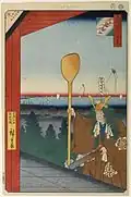 60. Los ríos Asakusagawa y Miyatogawa y la orilla del Ōkawa (浅草川大川端宮戸川 Asakusagawa Ōkawabata Miyatogawa?) (7-1857) | La acentuada verticalidad de esta imagen queda remarcada por la amplitud del cielo y la reducción del paisaje a una franja en la parte inferior, mientras que el costado izquierdo está cubierto nuevamente en un primer plano por un largo mástil formado por papeles rojos y blancos, propio de la peregrinación al monte Ōyama, en la prefectura de Kanagawa, 60 kilómetros al sur de Edo. El monte se abría a los peregrinos el día 27 del sexto mes, realizándose antes de la partida una ceremonia de purificación en el río Sumida, bajo el puente Ryōgoku, hecho mostrado en esta imagen. En el ángulo inferior izquierdo aparecen las cabezas de varios peregrinos, con pañuelos de color blanco y azul, mientras en el lado derecho otra barcaza transporta más pasajeros, encabezada por un asceta del monte (yamabushi), que toca una caracola. Este tramo del río Sumida recibía varios nombres, plasmados en el título; en tiradas posteriores, se cambió por Barcos cerca de Ryōgoku con una vista de Asakusa a lo lejos (Ryōgoku senchū Asakusa enkei), de más actualidad.[74] | |||||||
