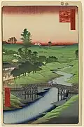 22. Hiroo a orillas del río Furukawa (渋谷区広尾 Hiroo Furukawa?) (7-1856) | El río Furukawa transcurre sinuosamente entre colinas de color verde con tonos marrón, cruzado por un puente curvo sobre el que transitan pequeñas figuras, algunas con sombrillas. El río es de un azul claro, con tonos más oscuros en las orillas. En el lado izquierdo se ve la posada Kitsune («El zorro»), famosa por su especialidad de unagi (anguila de agua dulce asada). El cielo es de tono rosáceo, característico del amanecer. Este idílico paisaje no existe actualmente, ya que el río fue canalizado y la zona urbanizada, siendo en la actualidad uno de los barrios más elegantes de Tōkyō.[37] | |||||||