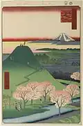 25. El Fuji original en Meguro (目黒元不二 Meguro Moto-Fuji?) (4-1857) | Esta es una visión análoga a la lámina anterior, donde el monte Fuji se ve desde una ladera de su falsa réplica. Esta imitación no es la misma que la anterior, sino una de 12 metros de altura erigida en 1812, y que por ser la primera era llamada «original». La vertiente de la colina domina el lado derecho e inferior de la estampa, de donde surge un alto pino cuyas ramas ocupan toda la parte superior derecha. Estos elementos dan paso a un plano medio con un jardín de cerezos donde un grupo de gente efectúa un pícnic campestre, mientras en el horizonte se yergue el majestuoso volcán considerado como un dios por los japoneses. Hay que remarcar que los cerezos no están en flor, sino que tienen hojas otoñales, confeccionadas en color tan (cinabrio); sin embargo, por su conexión temática con la estampa anterior fue englobada dentro del conjunto dedicado a la primavera. El cielo tiene una sutil gradación desde el tono rojizo, pasando por el blanco y el amarillo, hasta un límpido azul que se vuelve más oscuro en la parte superior.[40] | |||||||