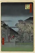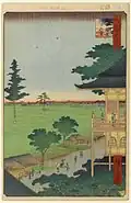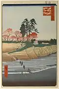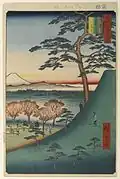 27. Jardín de ciruelos en Kamada (大田区蒲田 Kamada no umezono?) (2-1857) | Esta es una de las más bellas láminas de la serie, sobre todo por su tratamiento atmosférico y su exquisita paleta de colores para el cielo, desde el rosa blanquecino hasta el rojo oscuro, pasando por todas las gradaciones de estos colores, mostrando un amanecer lírico y evocador. La escena se desarrolla en un jardín de ciruelos, florecidos con sus delicadas flores blancas. Se ve en el medio fondo varios pabellones y personas paseando, mientras que en el lado derecho aparece recortado un palanquín, muestra del gusto del pintor por los elementos anecdóticos y las perspectivas inusuales. Esta estampa fue muy admirada en Occidente, especialmente por los impresionistas.[42] | |||||||