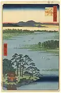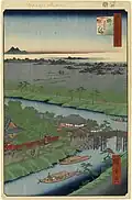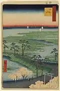 36. Vista desde la región de Massaki al bosque del santuario de Suijin, la pequeña ensenada del Uchigawa y al pueblo Sekiya no sato (真崎辺より水神の森内川関屋の里を見る図 Massaki atari yori Suijin no mori Uchigawa Sekiya no sato wo miru zu?) (8-1857) | En esta estampa se percibe con intensidad el gusto del autor por las perspectivas insólitas, mostrándose el paisaje a través de una ventana cortada por la mitad por una puerta corredera, tras la que aparece una rama de ciruelo. Probablemente se trate de una casa de té, y en la pared izquierda se ve parcialmente un jarrón con una flor de magnolia. La vista ofrece una panorámica de la región de Massaki, al norte del barrio del placer de Shin-Yoshiwara, circundado por el río Sumida, que es transitado por varias embarcaciones. En el bosque de la derecha aparece el torii del santuario de Suijin, que aparecía en la estampa anterior. Al fondo se ve el Tsukubasan, y atraviesa el cielo una bandada de pájaros.[50] | |||||||