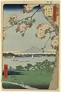 35. El bosque del santuario de Suijin y la región de Massaki a orillas del río Sumida (隅田川水神の森真崎 Sumidagawa Suijin no mori Massaki?) (8-1856) | De nuevo se nos muestra una vista desde un primer plano ocupado por un cerezo en el lado derecho, cuyas hermosas flores en tonos blancos y rosas se recrean en todo detalle, realizadas con la técnica de kimedashi («gofrado»), prensando el papel contra las marcas talladas de la plancha de madera. A los pies aparece el bosque del santuario de Suijin («divinidad acuática»), dedicado a la deidad del río Sumida, del que se ve el torii de entrada y un primer pabellón. En el camino, varias personas se dirigen al transbordador de Hashiba –que aparece en la lámina 37–, y al fondo se ve la región de Massaki y el monte Tsukubasan.[49] | |||||||