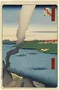 37. Los hornos y la barca de Hashiba a orillas del río Sumida (墨田河橋場の渡かわら竈 Sumidagawa hashiba no watashi kawaragama?) (4-1857) | Aparece de nuevo el transbordador de Hashiba de la lámina 35, que atraviesa el río Sumida, mientras el primer plano en la esquina inferior izquierda lo ocupan unos hornos de azulejos, de donde surge una columna de humo que se eleva al cielo, en una gradación de color de un gris oscuro hasta otro casi blanquecino. En el agua del río se mecen varias gaviotas de la especie miyakodori («ave de la capital»). En el bosque del fondo aparece el santuario de Suijin, y al fondo a la izquierda nuevamente el Tsukubasan. Las franjas azul y amarilla del cielo aparecen solo en las primeras tiradas, pues no estaban indicadas en la plancha, pero se corresponden con la técnica atenashi bokashi.[51] | |||||||