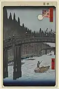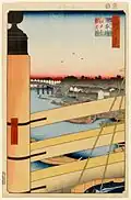 43. Los puentes Nihonbashi y Edobashi (日本橋江戸ばし Nihonbashi Edobashi?) (12-1857) | De nuevo una curiosa composición de un fondo paisajístico vislumbrado a través de un primer plano constituido por los travesaños del puente, con un alto pilar que ocupa todo el lateral izquierdo y una cesta de pescado (atún) recortada en el derecho, acarreada por un transeúnte que no aparece en la imagen. Los maderos pertenecen al puente Nihonbashi («Puente de Japón» o «Puente del sol naciente»), mientras que el que aparece al fondo es el Edobashi («Puente de Edo»). En el horizonte se puede ver el rojo disco del sol que amanece. Con esta lámina empieza la serie dedicada al verano, coincidiendo el motivo elegido (el puente Nihonbashi) con la lámina 1 que iniciaba la primavera. La vista que se ve aquí es hacia el este, la contraria de la lámina 1.[57] | |||||||