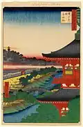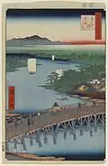 39. El templo Kinryūzan en Asakusa y el puente de Azumabashi desde lejos (吾妻橋金龍山遠望 Azumabashi Kinryūzan enbō?) (8-1857) | Se aprecia de nueva una insólita visión donde el paisaje es atravesado por una embarcación de recreo que, sin embargo, está cortada a ambos extremos, vislumbrándose a la izquierda el peinado y el vestido de una geisha de la que no se ve el rostro. Al fondo se ve un muelle y un conjunto de casas de las que sobresale el templo de Kinryūzan («templo del dragón dorado», actual Sensō-ji), al lado de cuyo edificio principal se yergue una pagoda de cinco pisos. Más lejano se eleva el nevado monte Fuji. En toda la composición flotan unas hojas de cerezo, dando un tono poético a toda la estampa, en el que se percibe el contraste entre lo efímero y lo eterno: las efímeras hojas frente al eterno Fuji, el efímero amor de la geisha frente al eterno misticismo del templo.[53] | |||||||