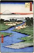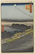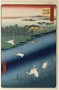 67. El transbordador de Sakasai (逆井のわたし Sakasai no watashi?) (2-1857) | Domina la composición el río Nakagawa («río medio»), en diversos tonos de azul, más oscuro el central por ser la parte más honda del río, y con un tono verdeazulado en la zona de cañaverales de la parte inferior. En el río y sobrevolándolo aparecen unas garzas reales, de un límpido color blanco, estucado sin pigmentos (karazuri). En la franja del horizonte se ve una zona boscosa a la izquierda y un pequeño poblado a la derecha, donde atraca el transbordador al que alude el título. Al fondo aparece la cadena montañosa de la península de Chiba, al este de Edo, envuelta en la bruma, bajo un cielo en tonos blancos y rojizos.[81] | |||||||