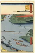 70. La desembocadura del río Nakagawa (中川口 Nakagawaguchi?) (2-1857) | El protagonista de la estampa es el río, que domina la composición en su eje vertical, así como en su zona central. El Nakagawa es el que transcurre horizontalmente, desembocando a la derecha en la bahía de Edo, fuera de esta imagen. Aparecen en sus aguas varias barcas de pescadores y unas balsas de madera transportadas por remeros. El tramo inferior, por el que navegan dos barcas de pasajeros, es el canal Onagigawa, donde había un puesto de control militar. En el extremo opuesto se ve el canal Shinkawa, con unas barcas cubiertas de paja que transportaban sal, que se producía en las inmediaciones. Este canal se pierde en la lejanía entre una espesa neblina de color blanco, graduada en ichimonji bokashi.[84] | |||||||