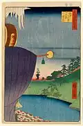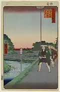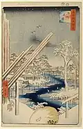 40. La ermita de Bashō y la colina de las camelias junto al acueducto de Sekiguchi (せき口上水端はせを庵椿やま Sekiguchi jōsuibata Bashōan Tsubakiyama?) (4-1857) | La ermita estaba dedicada al gran poeta Matsuo Bashō, y fue construida por sus discípulos en el cincuenta aniversario de su muerte, en 1743. Se encontraba en Tsubakiyama («colina de las camelias»), propiedad de la familia Hosokawa (a la que pertenece Morihiro Hosokawa, primer ministro de Japón entre 1993 y 1994). El acueducto de Sekiguchi era de los principales suministros de agua de la ciudad, y se mantenía con un impuesto anual que pagaban todos los habitantes. Por el camino deambulan pequeñas figuras, como es habitual en las composiciones de esta serie, para otorgar un factor humano al paisaje.[54] | |||||||