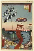 51. La procesión Sannō en Kōjimachi itchōme (糀町一丁目山王祭ねり込 Kōjimachi itchōme Sannō Matsuri nerikomi?) (7-1856) | El autor muestra nuevamente una inusual composición con un elemento destacado en primer término, en este caso la parte superior de un carro festivo (mikoshi) de la fiesta de Sannō, celebrada el 15 de junio en honor del dios Hiei Sannō. Esta estructura ocupa todo el lado izquierdo, formada por unas bandas de color azul sobre una vara de bambú, que se abren como velas, sobre las que aparece un gran «tambor de amonestación» (kankadori) rematado por un gallo del que solo se ve una pata y unas plumas blancas. Al lado del carro, en la esquina inferior izquierda, aparecen los sombreros blancos con flores rojas de los participantes en la procesión. Sobre la loma al otro lado del estanque se aprecia otro carro, en este caso con la figura de un mono, que se dirige al Palacio Hanzōmon. Esta festividad se celebraba cada dos años desde 1681, con procesiones de unas 50 carrozas y 500 personas ataviadas como en el período Heian (794-1185), que se dirigían desde el santuario de Hiei Sannō –cerca del Palacio del Shōgun– por todo el centro de la ciudad.[65] | |||||||