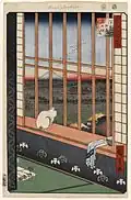 6. El picadero de Hatsune no baba en Bakuro-chō (馬喰町初音の馬場 Bakuro-chō Hatsune no baba?) (9-1857) | El picadero de Hatsune no baba –el más antiguo de Edo– se ve a través de una insólita perspectiva, a través de unas telas puestas a secar por los tintoreros del vecino barrio de Kon'ya, cuyos colores blanco, ocre y violeta armonizan con el cielo de fondo. Sobre los pabellones del picadero sobresale una torre de bomberos que daba servicio a toda la zona, un elemento familiar para Hiroshige, que había heredado el cargo de capitán de bomberos de su padre en 1809, y que a su vez legó a su hijo en 1832 para dedicarse de lleno a la pintura.[21] | |||||||