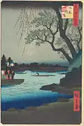 61. El «pino del éxito» y Oumayagashi sobre el río Asakusagawa (浅草川首尾の松御厩河岸 Asakusagawa Shubi no matsu Oumayagashi?) (8-1856) | El «pino del éxito» (Shubi no matsu) del título se alzaba sobre un embarcadero del río Sumida, cerca del almacén de arroz del barrio de Asakusa. Aquí se reunían parejas de amantes, circunstancia que queda enfatizada por el ambiente nocturno de esta estampa. En el lado izquierdo aparece entrecortado el transbordador de Oumayagashi –que hacía la ruta de Asakusa al barrio del placer de Shin-Yoshiwara–, tras cuya persiana cerrada se aprecia una silueta femenina, que quizá se dirige al lugar de citas. Sobre la barca se elevan las ramas del pino, que llegan hasta el centro de la imagen, mientras que en la empalizada de bambú de la izquierda acaba de atracar una barca de placer (yanebune). En la línea del horizonte se vislumbra aún la luz del ocaso, por encima del puente Azumabashi, mientras que arriba el cielo vespertino empieza a plagarse de estrellas, otorgando al conjunto una atmósfera de gran romanticismo.[75] | |||||||