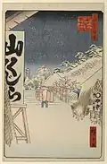 12. Ueno Yamashita (上野山した Ueno Yamashita?) (10-1858) | El principal foco de atención es el establecimiento de la derecha, un restaurante de comidas rápidas llamado Iseya, escrito en katakana y hiragana. Se percibe también en el cartel la inscripción shisomeshi, un plato de arroz con hojas de shiso. En la esquina inferior izquierda aparece un conjunto de elegantes damas con grandes sombrillas, que quizá se dirigen al cercano santuario de Ueno. En el cielo destaca una bandada de cuervos, que eran muy abundantes en esta región. Esta estampa se cree realizada por Hiroshige II, tras la muerte del gran maestro, aunque seguramente sobre algún boceto suyo, pues el nombre del autor de la serie aparece en la cartela roja de la esquina superior derecha.[27] | |||||||