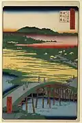 45. El puente Yatsumi no hashi (八ツ見のはし Yatsumi no hashi?) (8-1856) | Yatsumi no hashi quiere decir «vista de los ocho puentes», pues desde allí (actualmente es el Puente Ichikoku) se podían ver ocho puentes seguidos a lo largo del río. Nuevamente el autor antepone un primer plano en el costado derecho con unas ramas colgantes de sauce llorón, mientras que en la esquina inferior izquierda aparecen unos travesaños del puente. En plano medio se ve el río surcado por varias embarcaciones, tras el cual se suceden diversos puentes que se pierden en la lejanía. Los edificios del fondo corresponden al palacio del Shōgun, detrás del que se yergue la imponente majestuosidad del monte Fuji. El cielo tiene la habitual gradación de colores, atravesado por el vuelo de dos pájaros.[59] | |||||||