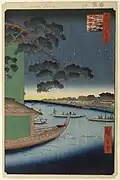 47. El pabellón Seidō y el río Kandagawa vistos desde el puente Shōheibashi (昌平橋聖堂神田川 Shōheibashi Seidō Kandagawa?) (9-1857) | Nueva composición por planos, donde destaca en primer término una colina que ocupa todo el lado izquierdo, dispuesta en diagonal y coronada por pinos. Se trata de la colina Shōheizaka, que comparte con el puente Shōheibashi –del que se ven unos maderos en la esquina inferior derecha– el elemento Shōhei, transcripción al japonés de Changping, el lugar de nacimiento de Confucio, cuya doctrina moral era la base de la administración estatal nipona. Tras el puente aparece el río Kandagawa surcado por varias embarcaciones, mientras que en la otra orilla varios transeúntes caminan por un sendero flanqueado por el muro que delimita el pabellón Seidō («Pabellón santo»), construido en 1690 como santuario del confucianismo. Esta estampa es la primera que presenta la lluvia, trazada con finas líneas que exigían una gran destreza por parte del grabador (horishi).[61] | |||||||
