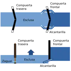 En la antigua China, las esclusas de diversos tipos ya eran conocidas por lo menos desde el siglo I a. C. (pues las fuentes de esa época no aluden a ellas como innovaciones), siendo utilizadas durante la antigua dinastía Han (202 a. C. - 220 d. C).[68] Sin embargo, en el año 984 se construyó la primera esclusa de dos compuertas, por obra del ingeniero Qiao Weiyo, comisionado adjunto de transporte para la ciudad de Huainan.[69] En esa época los chinos tenían problemas con el tráfico de gabarras, o barcazas, en la sección de Shanyang Yundao del Gran Canal, pues los barcos generalmente quedaban destruidos al pasar por los varaderos dobles, permitiendo que su carga de granos, destinados a pagar los impuestos, fuesen robados por bandidos locales. El texto del tratado histórico Song Shi (compilado en 1345) menciona que en el año 934: