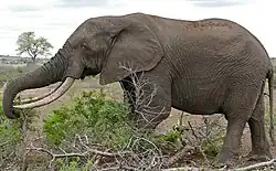 El elefante africano de sabana (Loxodonta africana) es un mamífero proboscideo de la familia de los elefántidos.[8] Es el mayor mamífero terrestre que existe en la actualidad. Se trata de una de las tres últimas especies de proboscídeos que sobreviven hoy en día, siendo las otras el elefante africano de bosque (Loxodonta cyclotis, previamente considerado una subespecie de L. africana, aunque su clasificación taxonómica se mantiene en duda) y el elefante asiático (Elephas maximus).