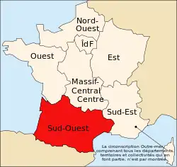 La Circunscripción del Suroeste es una circunscripción electoral francesa utilizada cada 5 años desde 2004 durante las Elecciones al Parlamento Europeo para designar, mediante una elección de sufragio universal directo, 10 de los 72 eurodiputados (78 en 2004) que le corresponden a Francia según el Tratado de Niza de los 736 miembros del Parlamento Europeo. Fue creada en 2003 mediante la Loi Électorale n° 2003-327 del 11 de abril de 2003.,[1] como las otras 7 circunscripciones electorales francesas para las elecciones europeas.