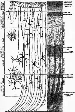 En 1899 Santiago Ramón y Cajal, publicó "Comparative study of the sensory areas of the human cortex", donde describe la citoarquitectura de V1, S1, M1.[3] Empleando el método de tinción Golgi, realizó una descripción completa de la organización intrínseca de la corteza cerebral del hombre y vertebrados, mostrando la estructura y conexiones de los distintos
