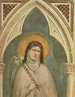 Santa Clara de Asís (en italiano: Chiara d'Assisi, nacida Chiara Scifi; Asís, 16 de julio de 1194-Asís, 11 de agosto de 1253) fue una religiosa y santa italiana. Seguidora fiel de san Francisco de Asís, con quien fundó la segunda orden franciscana o de hermanas clarisas, Clara se preciaba de llamarse «humilde planta del bienaventurado padre Francisco».[1] Después de abandonar su antigua vida de noble, se estableció en el monasterio de San Damián el resto de sus días.