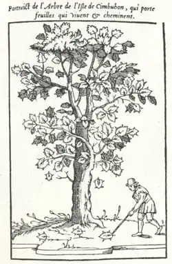 ![]() Frontispicio del 'Arbre de l'Isle de Cimbubon, que porta hojas que viven & caminan | ||