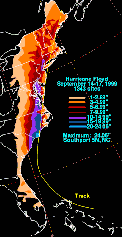 Las fuertes lluvias acompañan a los ciclones tropicales y sus remanentes que se desplazan hacia el noreste desde la costa del Golfo de México, así como hacia el interior desde el océano Atlántico subtropical occidental. En los últimos 30 años, el ciclón tropical más lluvioso que azotó el estado fue el huracán Florence en septiembre de 2018, que dejó caer más de 35 pulgadas (890 mm) de precipitaciones al noroeste de Elizabethtown. Durante los huracanes Hazel y Fran, la principal fuerza de destrucción provino de las precipitaciones. Antes de que el huracán Floyd llegara a Carolina del Norte, el estado ya había recibido grandes cantidades de lluvia del huracán Dennis menos de dos semanas antes de Floyd. Esto saturó gran parte del suelo del oeste de Carolina del Norte y permitió que las fuertes lluvias del huracán Floyd se convirtieran en inundaciones. Más de 35 personas murieron a causa de Floyd.[16] En las montañas, el huracán Frances de septiembre de 2004 fue casi igual de lluvioso, con más de 23 pulgadas (580 mm) de precipitaciones en Monte Mitchell.[24]