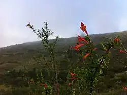 Clinopodium speciosum es una planta categorizada como arbusto que llega a medir hasta los 2 metros de altura; tienen flores anaranjadas o rojas en forma de trompeta; compuesta por 4 estambres amarillos con antenas magentas; las hojas tienen un olor fuerte a menta; crece en matorrales a altitudes que van desde 3500 hasta los 4400 m.[4]
